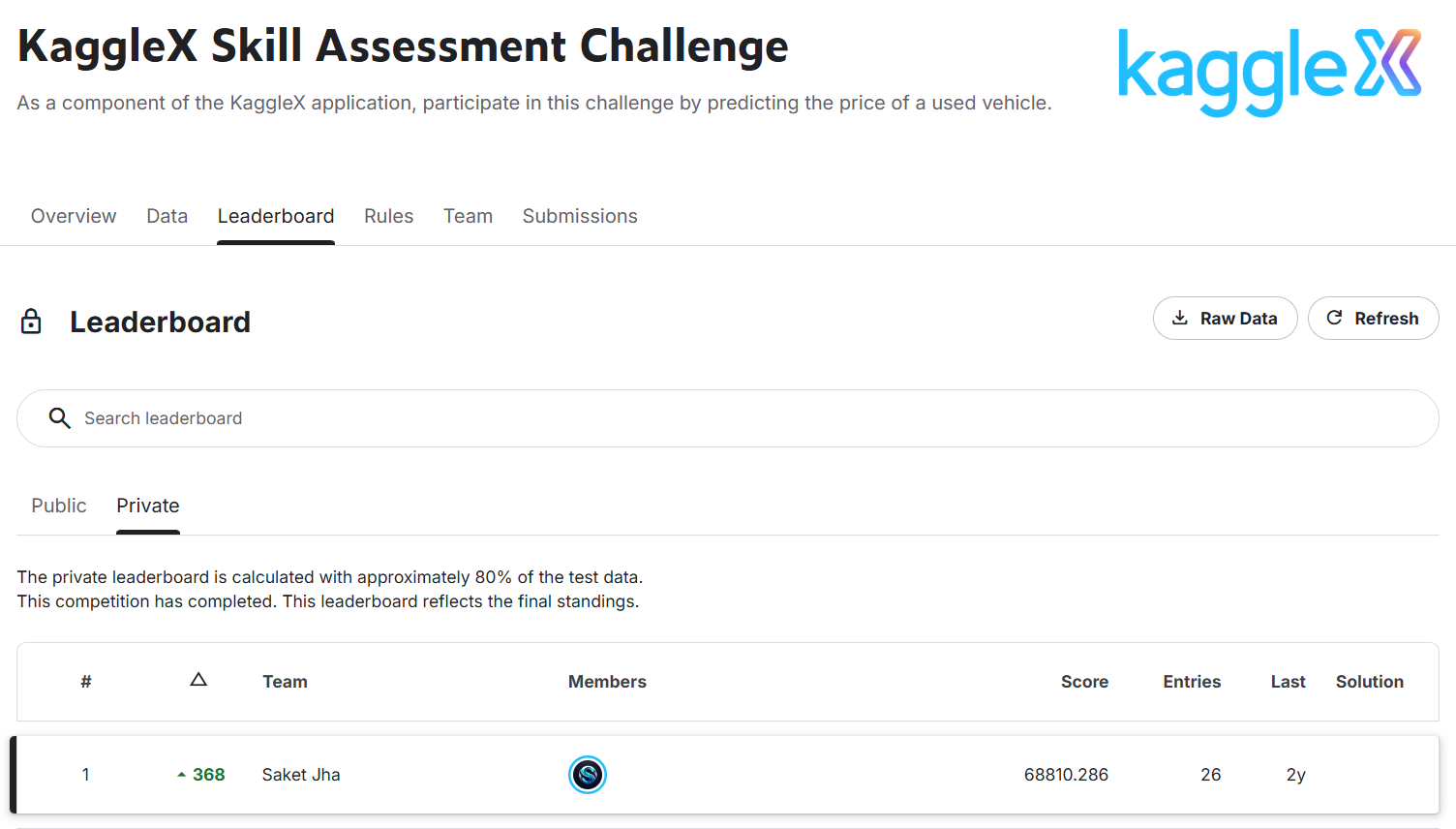 This post is about how I won the KaggleX Skill Assessment Machine Learning Competition. Disclaimer: I was just a beginner in machine learning and Kaggle competitions when I started. This competition ran for about 20 days, and I improved day by day and climbed up the leaderboard. Initially, I was ranked around 368-ish on the private leaderboard, but when the competition ended, the tables turned and I was Rank 1.